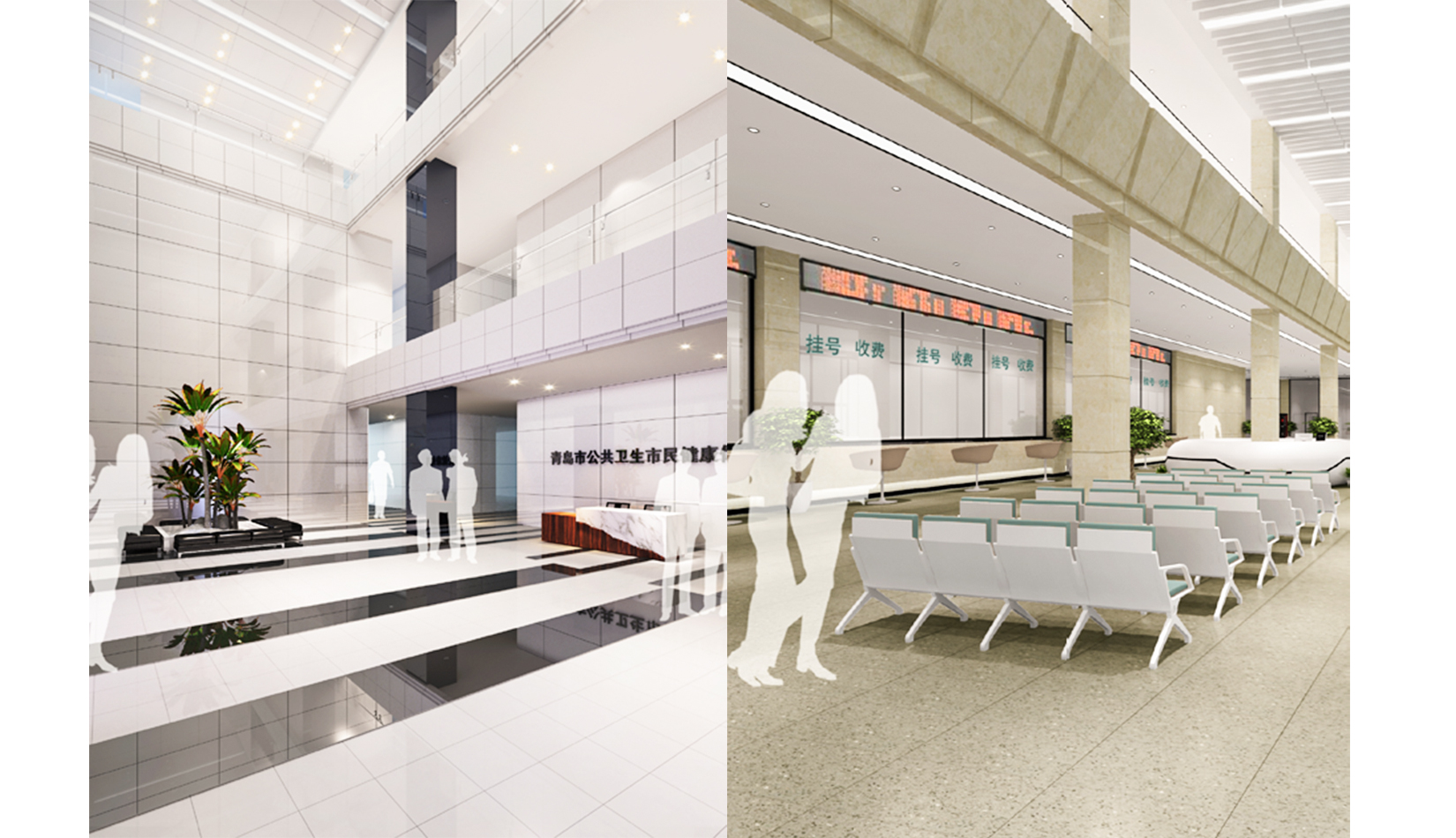 結(jié)合周邊的環(huán)境和節(jié)省造價的因素綜合考慮,建筑立面為干凈簡潔的現(xiàn)代風格,臨床中心以橫向線條為主,公共衛(wèi)生中心以豎線條為主,市民健康體驗中心強調(diào)建筑的標志性;建筑平面主要解決不同功能的區(qū)域劃分和避免流線交叉的問題。