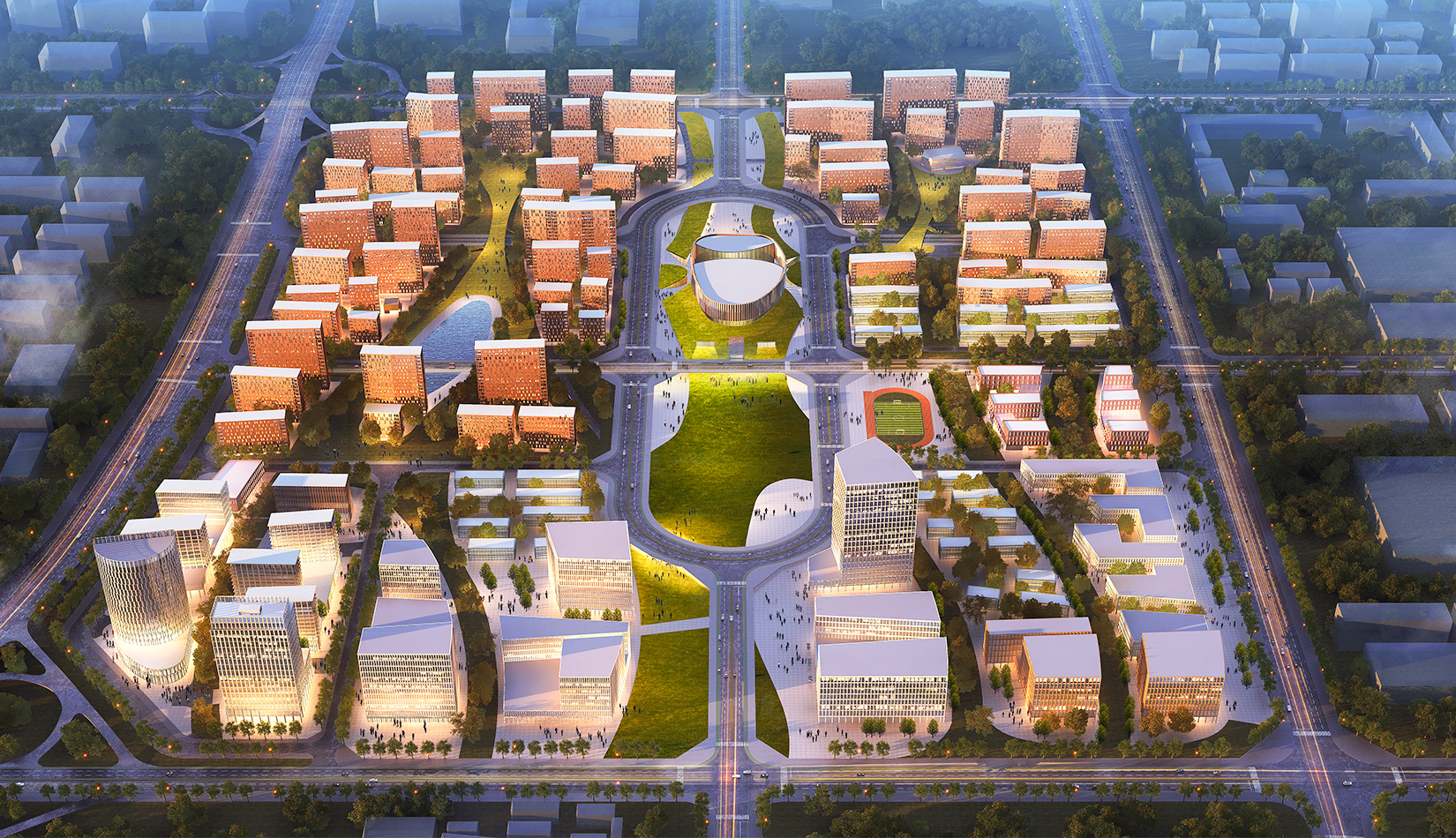 生態(tài)規(guī)劃以“生命之樹“為主題,以南側(cè)的“安全生產(chǎn)管理研發(fā)區(qū)域”作為科學(xué)基礎(chǔ),以“三生”安全景觀軸為貫穿南北,并與遠(yuǎn)處的泰山遙遙相應(yīng)。自西往東,三大安全景觀軸分別象征“生態(tài)”、“生機(jī)”和“生活”:西側(cè)軸線整合現(xiàn)狀水塘及古井,使之成為景觀的一部分,結(jié)合濃密的種植,充分展現(xiàn)生態(tài)主題;中央?yún)^(qū)域廣場(chǎng)綠地景觀帶與體育文化場(chǎng)館相配合,強(qiáng)調(diào)了健康、運(yùn)動(dòng)的生機(jī)氣象, 展示生命健康與安全的信息和設(shè)施;東側(cè)的景觀帶側(cè)與學(xué)校串聯(lián),結(jié)合住宅小區(qū),為人們提供全天候的戶外生活場(chǎng)所,展示生活安全理念和技術(shù)。景觀帶延綿起伏,在道路交匯處延續(xù)地景設(shè)置人行設(shè)施,確保步行的安全。
