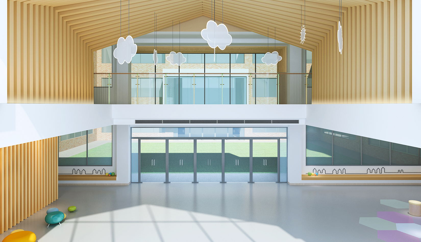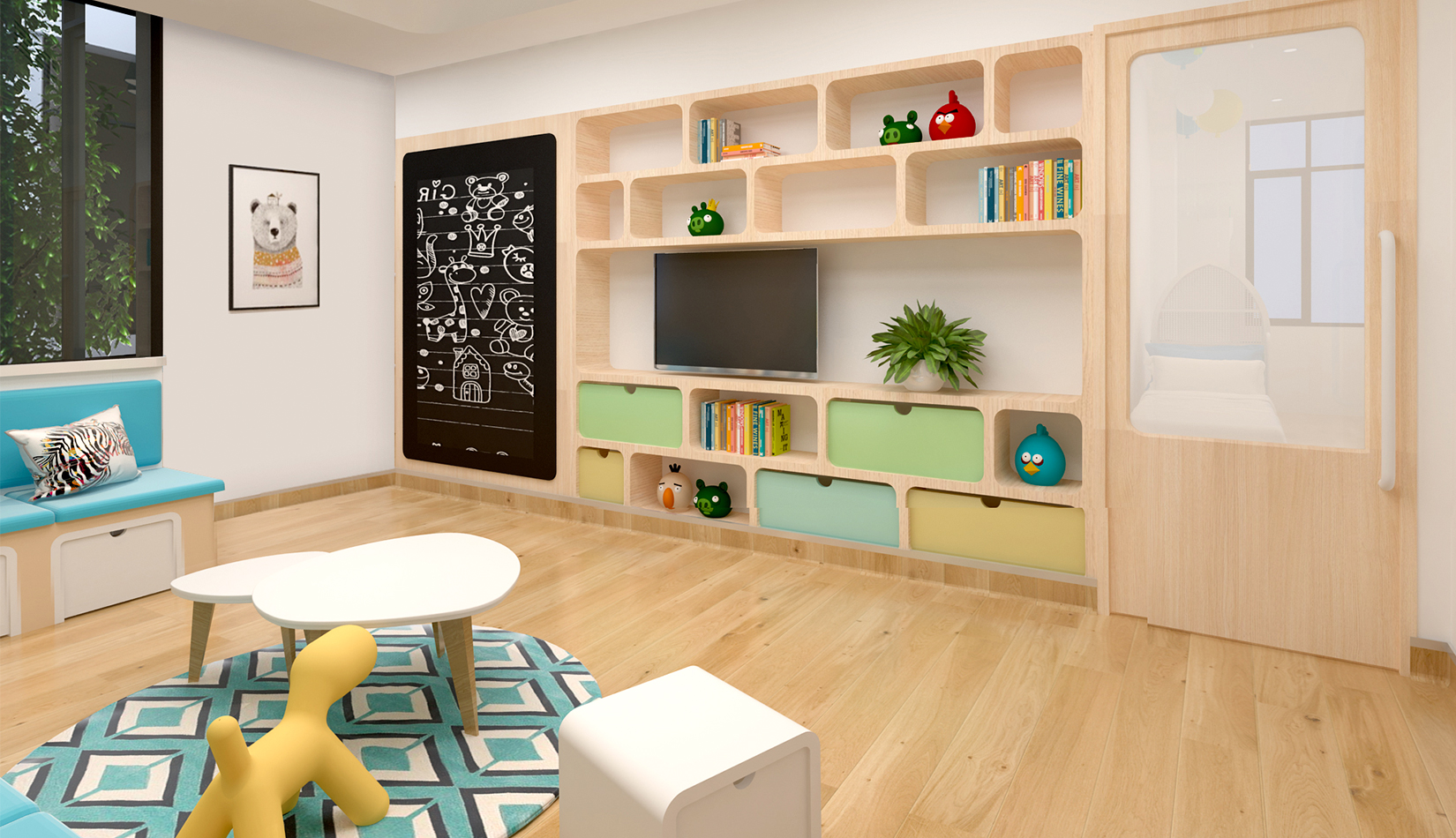 室內(nèi)延續(xù)建筑,空間內(nèi)部采光非常好。設(shè)計簡潔、現(xiàn)代,以白色為主色調(diào),搭配淺木色作為室內(nèi)顏色?;顫姟⒑脛?、天真、可愛是兒童最大的特點(diǎn),在其具體功能空間設(shè)計中,我們把這些特點(diǎn)和空間色彩結(jié)合起來,不同的空間根據(jù)其使用功能,采用了不同的色彩搭配。