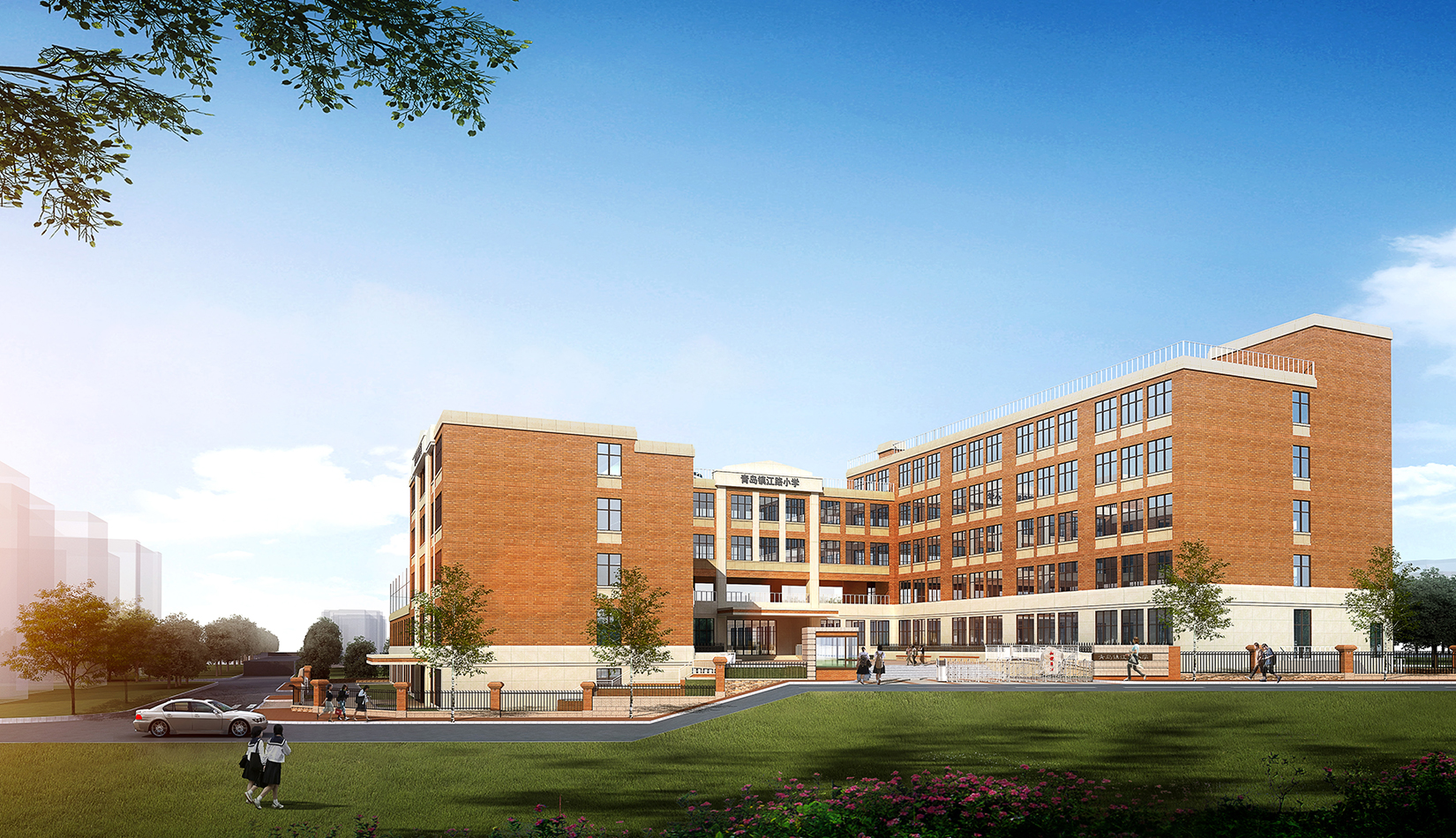 該項(xiàng)目的設(shè)計(jì)延續(xù)區(qū)域肌理,與區(qū)域城市肌理相融合,提高區(qū)域環(huán)境。立面設(shè)計(jì)考慮市南區(qū)及鎮(zhèn)江路原有學(xué)校風(fēng)格,采用學(xué)院派建筑風(fēng)格,塑造古典人文氛圍,校園墻體通過磚的變化設(shè)計(jì)文化墻,將文化傳承與精神傳承融合在建筑之中。根據(jù)地勢和日照進(jìn)行功能布局排列,下沉庭院、連廊和架空設(shè)計(jì)的鄰近操場的校園環(huán)境設(shè)計(jì),一方面塑造了豐富多彩的校園環(huán)境,另一方面充分保證了室內(nèi)環(huán)境的采光,讓孩子們更多地享受陽光。