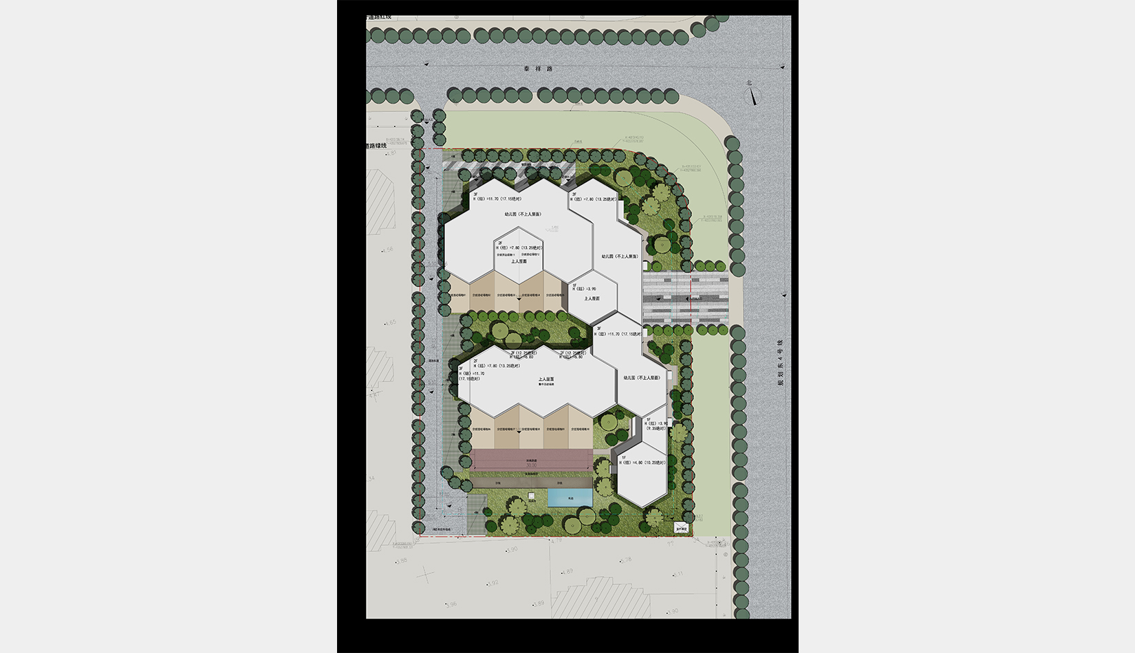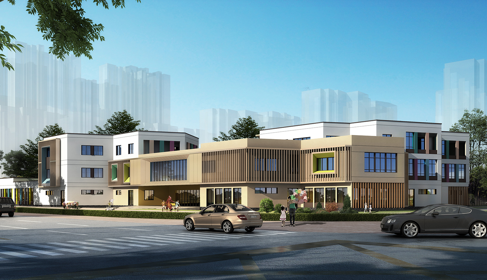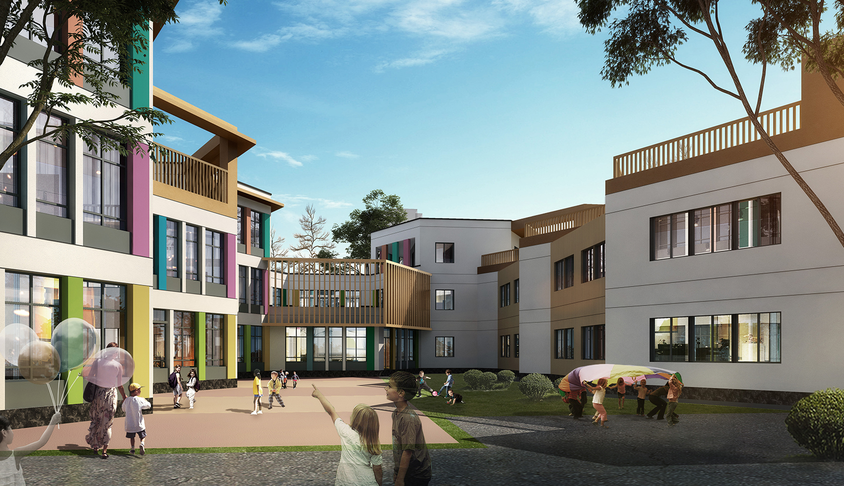 整體建筑以暖色調(diào)為主,旨在為幼兒營(yíng)造一種溫馨的環(huán)境氛圍,以紅色陶土板為基調(diào),與周邊古典風(fēng)格的住宅區(qū)相融合。彩色的運(yùn)用象征著孩子活潑多彩的個(gè)性,迎合了孩子對(duì)色彩的敏感特性,營(yíng)造出一種五彩斑斕的活潑的環(huán)境氛圍;彩色具有強(qiáng)調(diào)作用,可以突出建筑作為幼兒園的功能性,同時(shí)白色作為整體環(huán)境的基調(diào)色,協(xié)調(diào)了不同色彩間的沖突感受,使建筑氛圍呈現(xiàn)簡(jiǎn)潔明凈而又突顯夢(mèng)幻的特點(diǎn)。