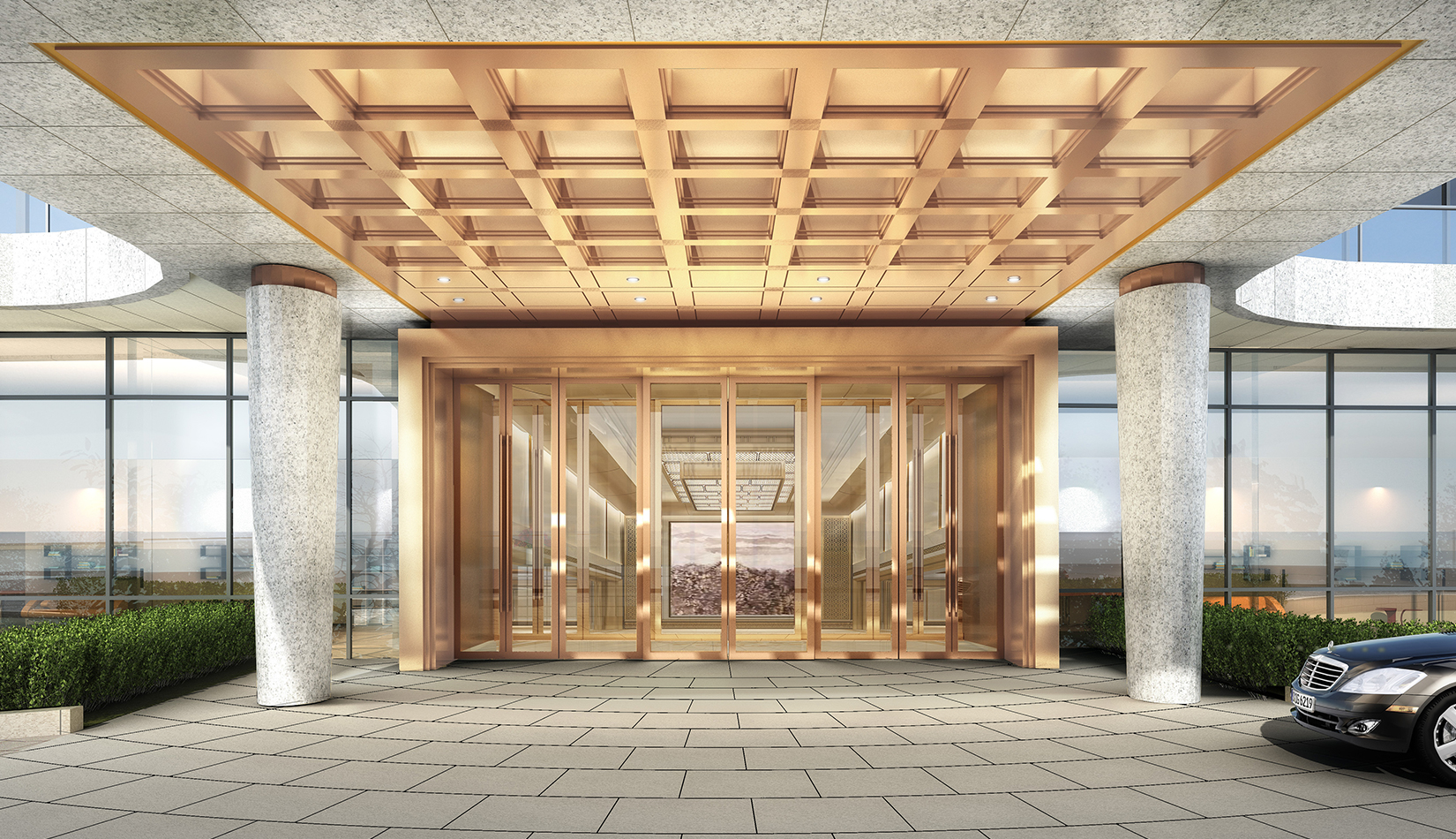 一層走廊---走廊為大廳一部分延續(xù)迎賓大廳的設(shè)計風格,天花跌級有序,方圓向上,內(nèi)嵌如意紋理淺雕銅板, 增加厚重、文化與層次,墻面挺拔向上轉(zhuǎn)折有序,頭尾嵌入水紋樣式銅板雕刻,增加儀式感與莊重性,同時提升文化附加,簡練現(xiàn)代、精致細節(jié),突顯別致有序、莊重典雅。