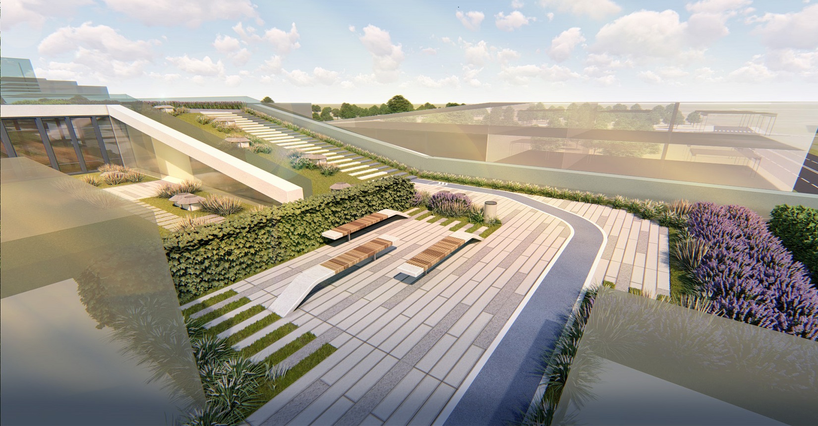 強調(diào)室內(nèi)空間和室外空間的融合,利用屋面打造慢行系統(tǒng),使建筑成為公園的組成部分,將公園景觀引入建筑當(dāng)中,打造具有標(biāo)志性的城市客廳、一個戶外生態(tài)客廳、原生態(tài)的生活空間,鼓勵面對面的交流,員工之間的交流,員工與客戶的交流,鄰里之間的交流。使用一條流動的能量線環(huán)形慢跑道,串聯(lián)整個空間傳達(dá)先進、高能量與流動的整體形象。
